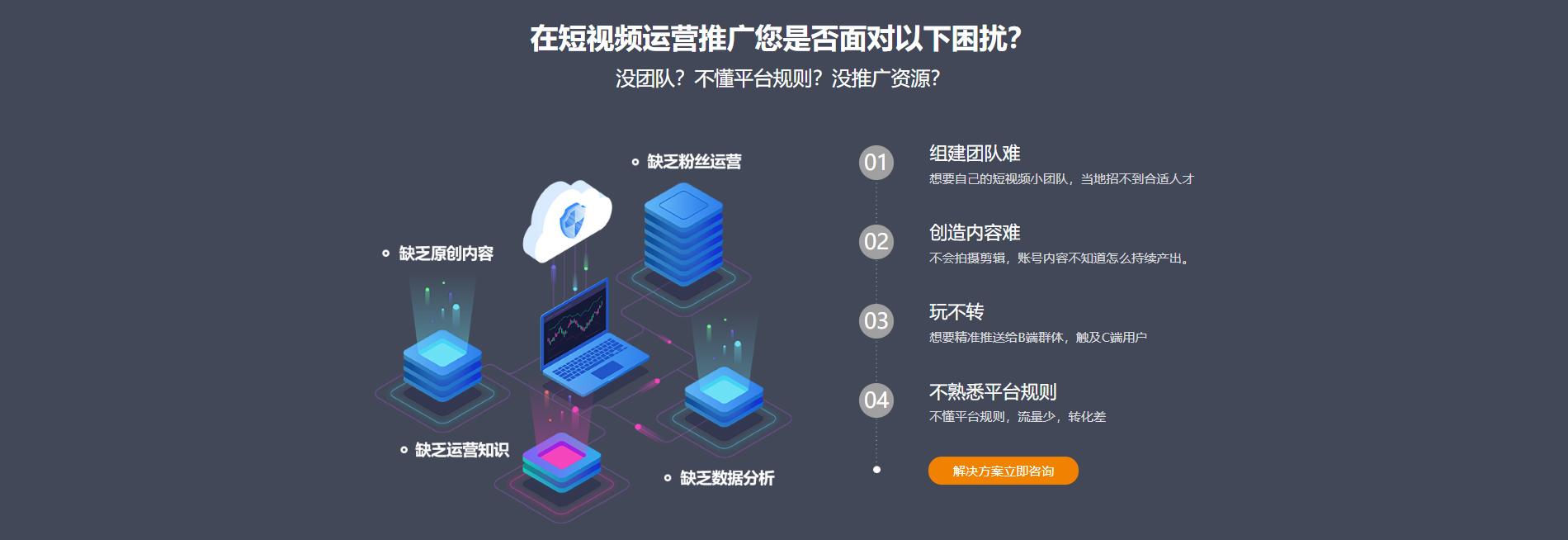 3. 一站式托管 定位,內容策劃,腳本撰寫,拍攝剪輯,提供一條龍的短視頻代運營推廣服務。